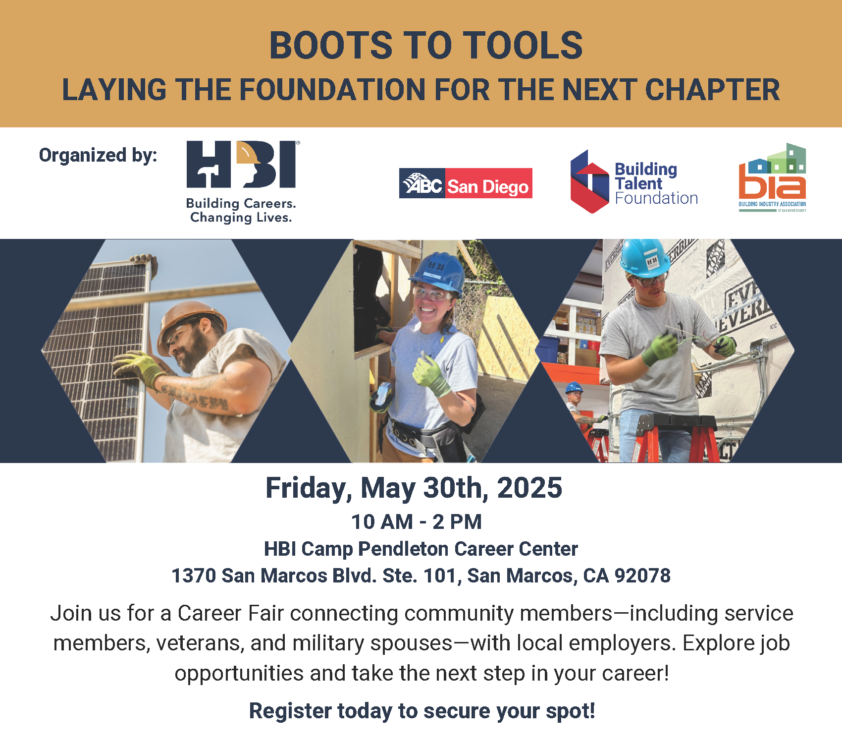 Hosted in collaboration with Home Builders Institute, Building Talent Foundation, and the Building Industry Association of San Diego, this event provides direct access to training programs and employers who value your military experience and are actively hiring.